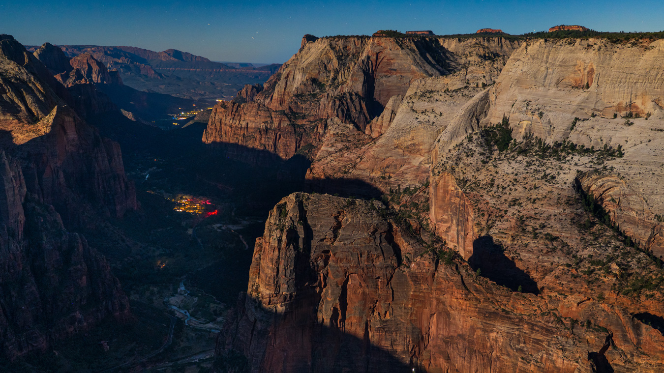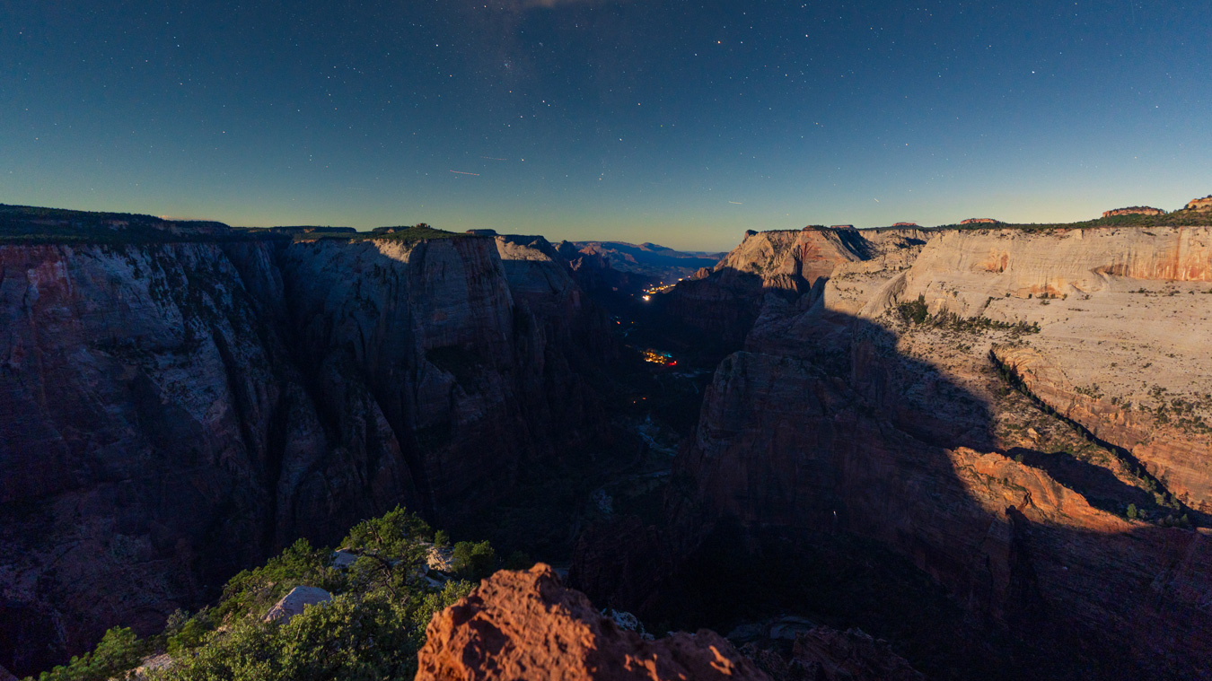 The last traces of sunset faded, and the canyon fell into darkness. For a brief moment, everything felt flat, like the detail and depth had been swallowed by the night. The stars became visible in the night sky. The comings and goings of car lights travelling between Zion Lodge. And even the milky way core made its presence known. But then a faint glow appears in the air.